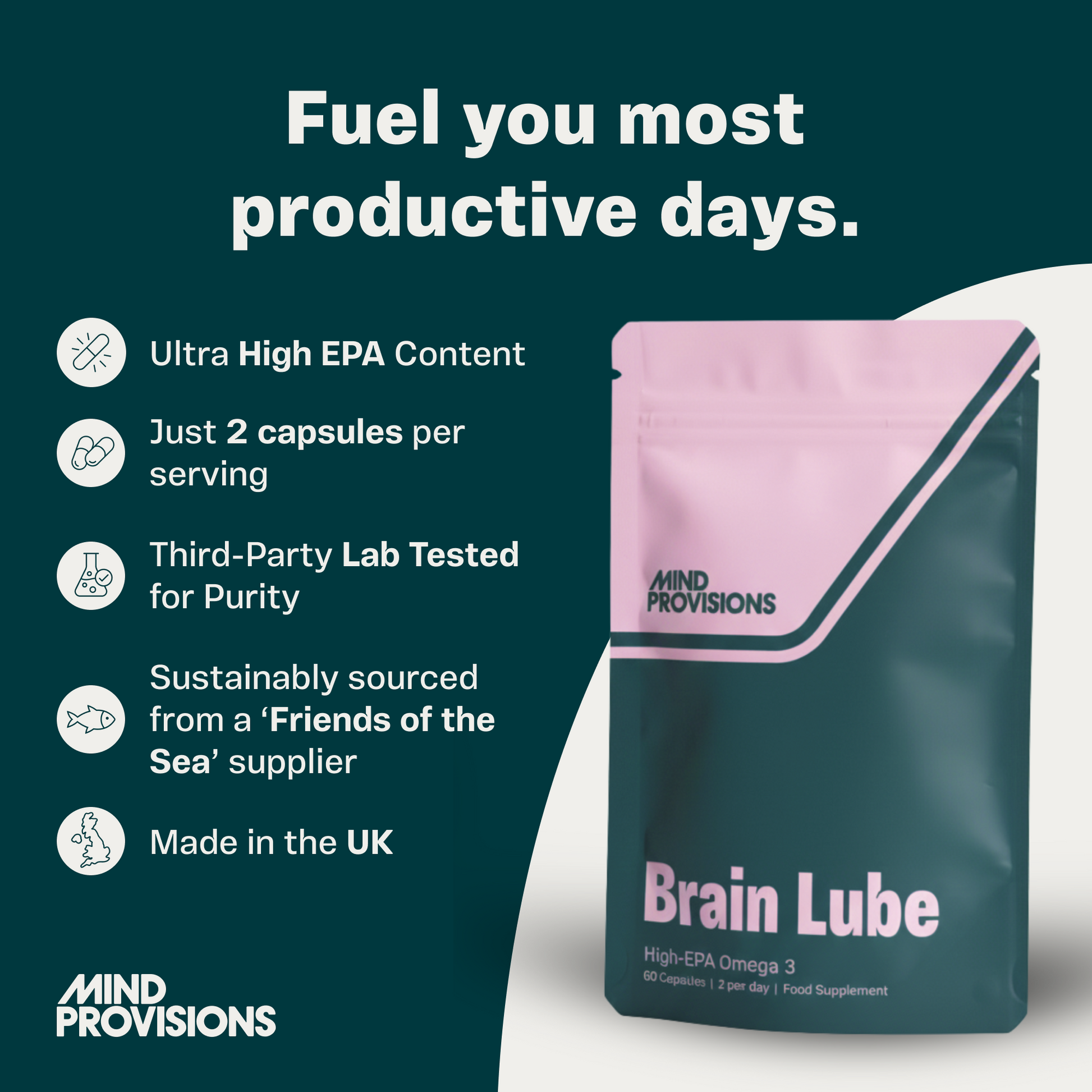 Brain Lube is a high-EPA Omega 3 supplement designed to help support your daily mental performance and wellbeing. While some people feel more mentally clear or energised in the first couple of weeks, the most noticeable effects often build gradually over 1 to 3 months with consistent use.