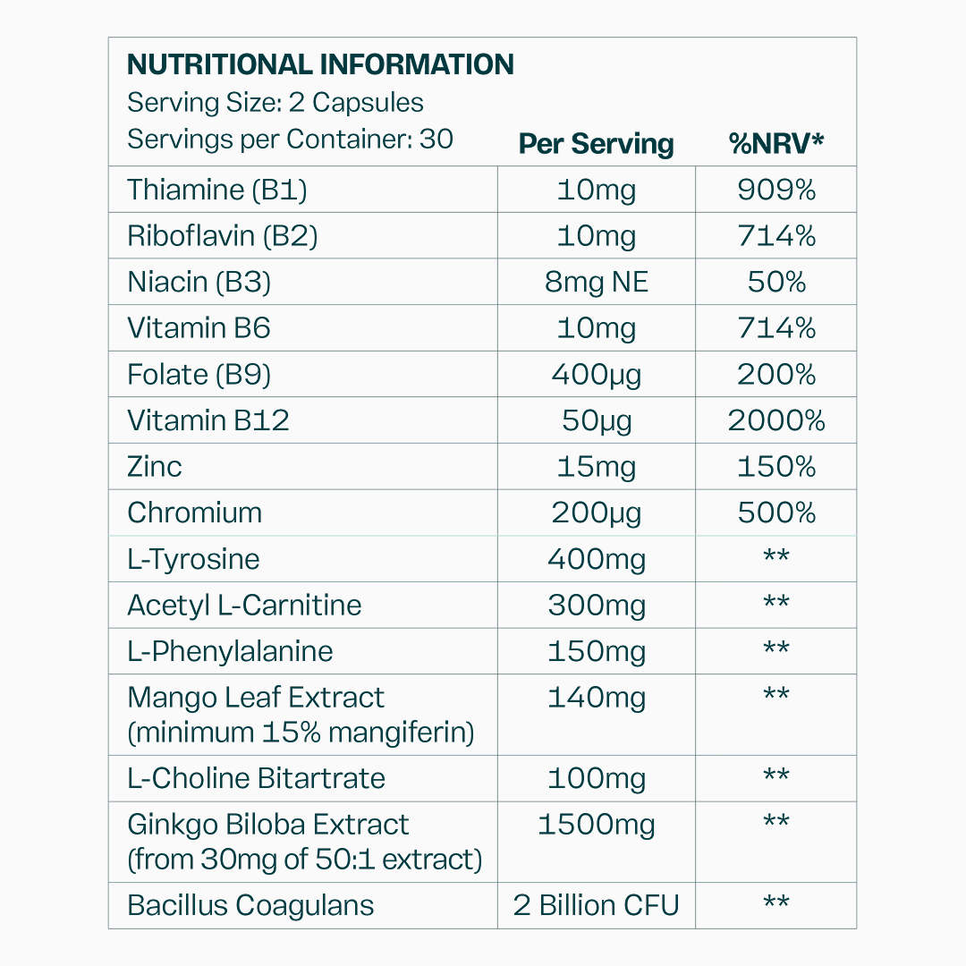 With L-Tyrosine and key B-Vitamins that help your brain stay on track
